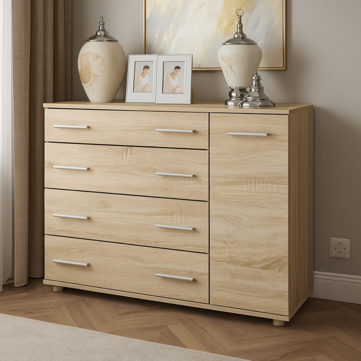 Світлий деревний відтінок дуб сонома надає комоду універсального вигляду.