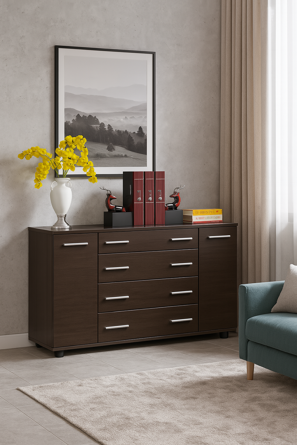 Комод К-4 – це елегантні та функціональні меблі, які стануть відмінним доповненням до будь-якого інтер’єру. Модель оснащена чотирма висувними шухлядами та двома місткими відділеннями з полицями та дверцятами, що забезпечує зручну організацію зберігання.