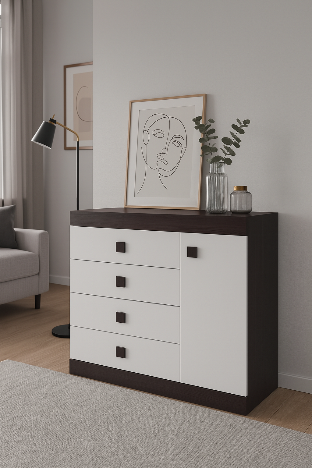 ✅ З чотирма висувними шухлядами та одним відділенням із дверцятою цей комод забезпечить вам великий простір для зберігання різних предметів. Тут ви зможете зручно розмістити одяг, постільну білизну, документи або інші дрібниці, зберігаючи порядок та легкість доступу до речей.