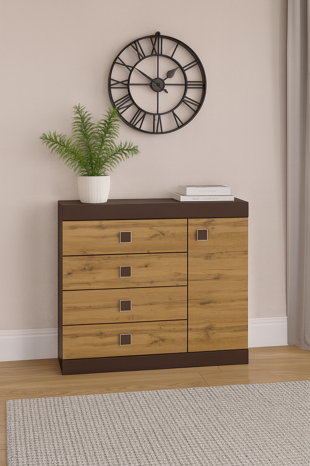 Комод С5-1050 – це справжнє втілення стилю та практичності у меблевому дизайні. Він виконаний з високоякісного дерева, що надає йому міцності та довговічності. З чотирма висувними шухлядами та одним відділенням із дверцятою цей комод забезпечить вам великий простір для зберігання різних предметів. Тут ви зможете зручно розмістити одяг, постільну білизну, документи або інші дрібниці, зберігаючи порядок та легкість доступу до речей.