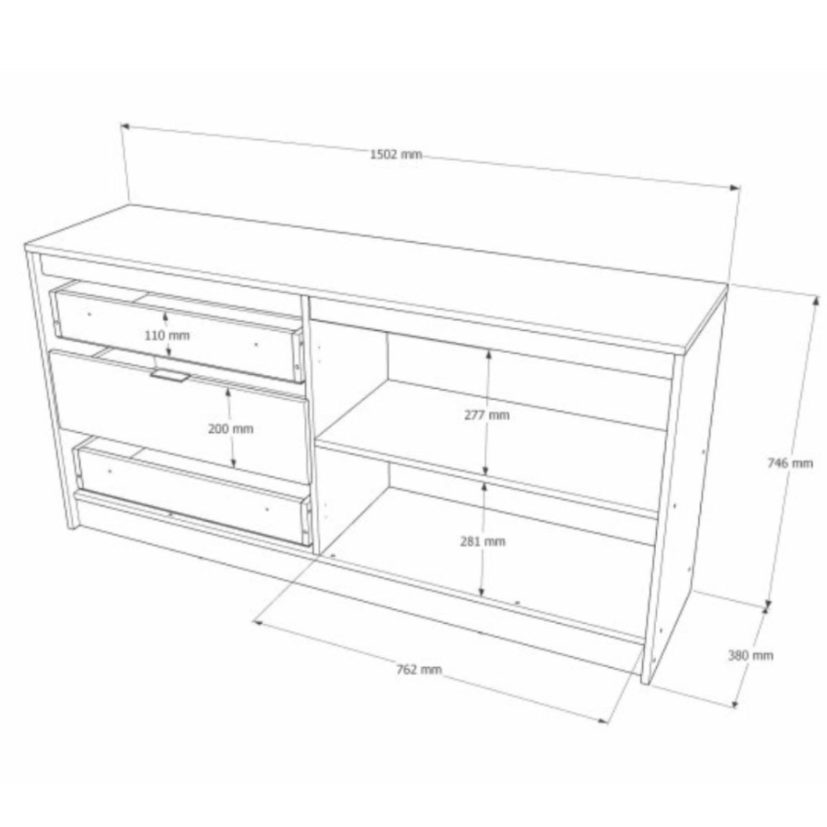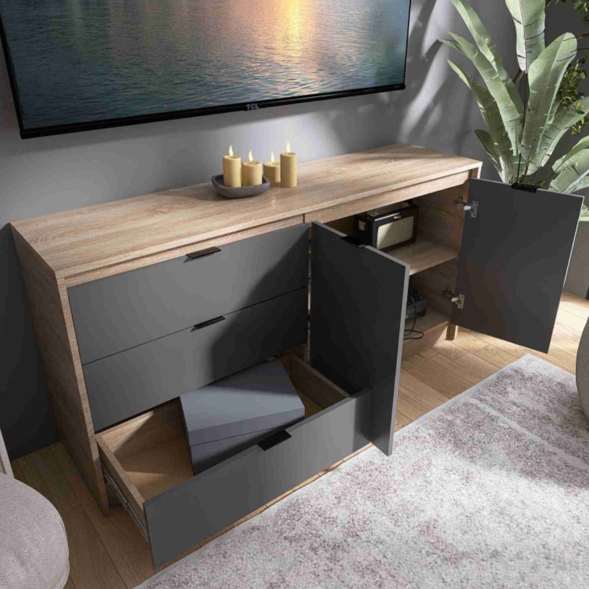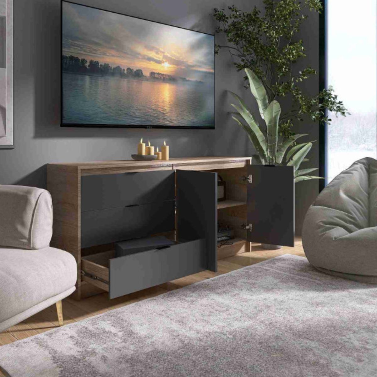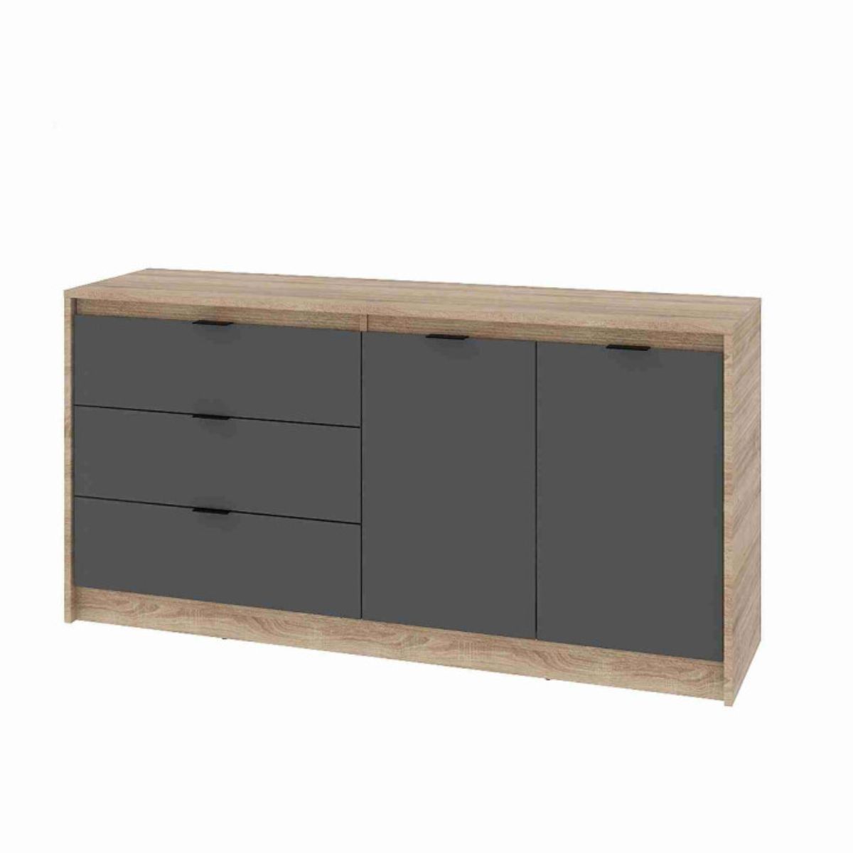Комод СТ-2 з 2 шухлядами та двома тумбами, 150 × 38 × 75 см, дуб сонома / графіт