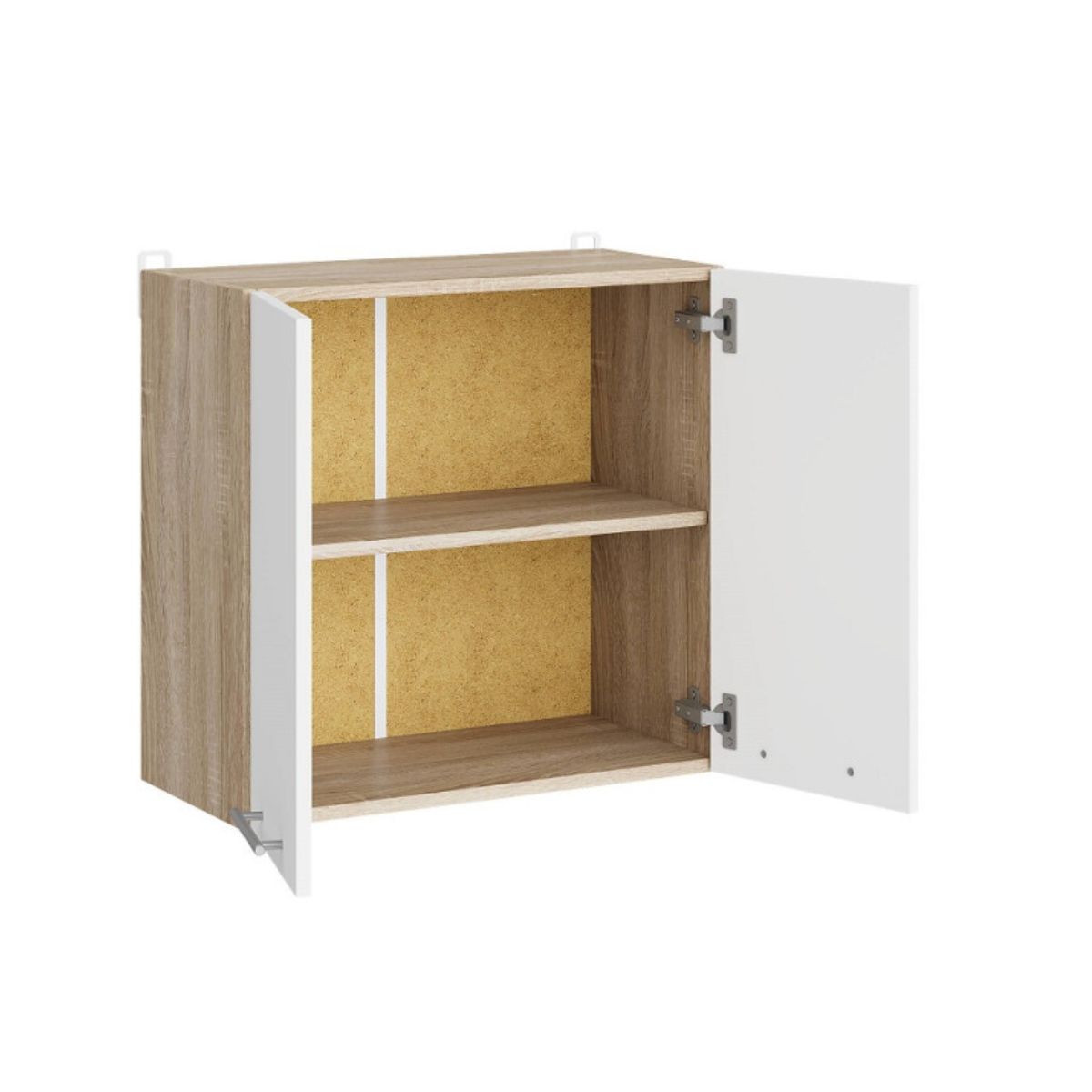 Модуль призначений для встановлення у верхній частині кухонного гарнітура та гармонійно поєднується з кухонними меблями у кольорах дуб сонома та білий.