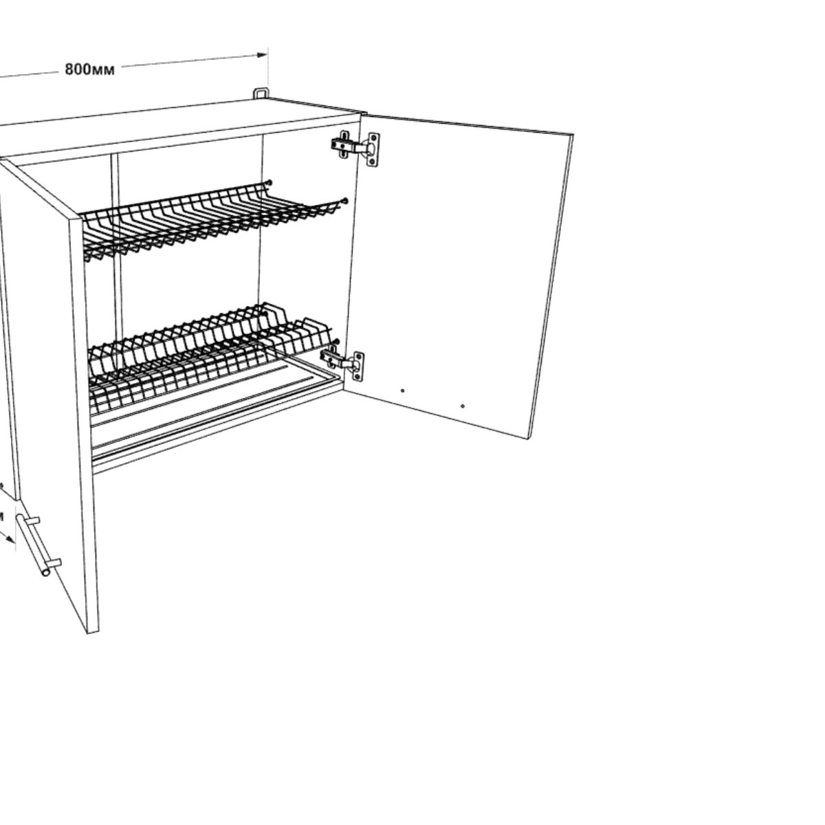 Конструкція шафи передбачає можливість встановлення сушарки для тарілок і чашок, що дозволяє зручно розміщувати посуд після миття та підтримувати порядок на кухні. Шафа легко поєднується з іншими навісними елементами кухонних меблів і допомагає створити функціональний кухонний простір.