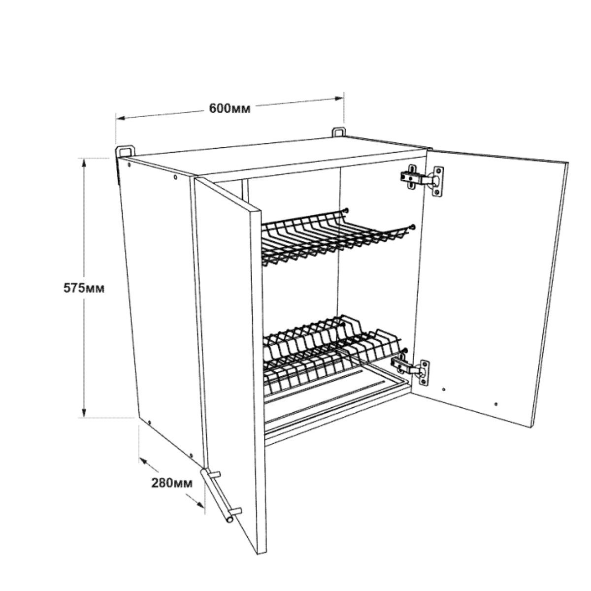 Конструкція шафи передбачає можливість встановлення сушарки для тарілок і чашок, що дозволяє зручно розміщувати посуд після миття та підтримувати порядок на кухні.