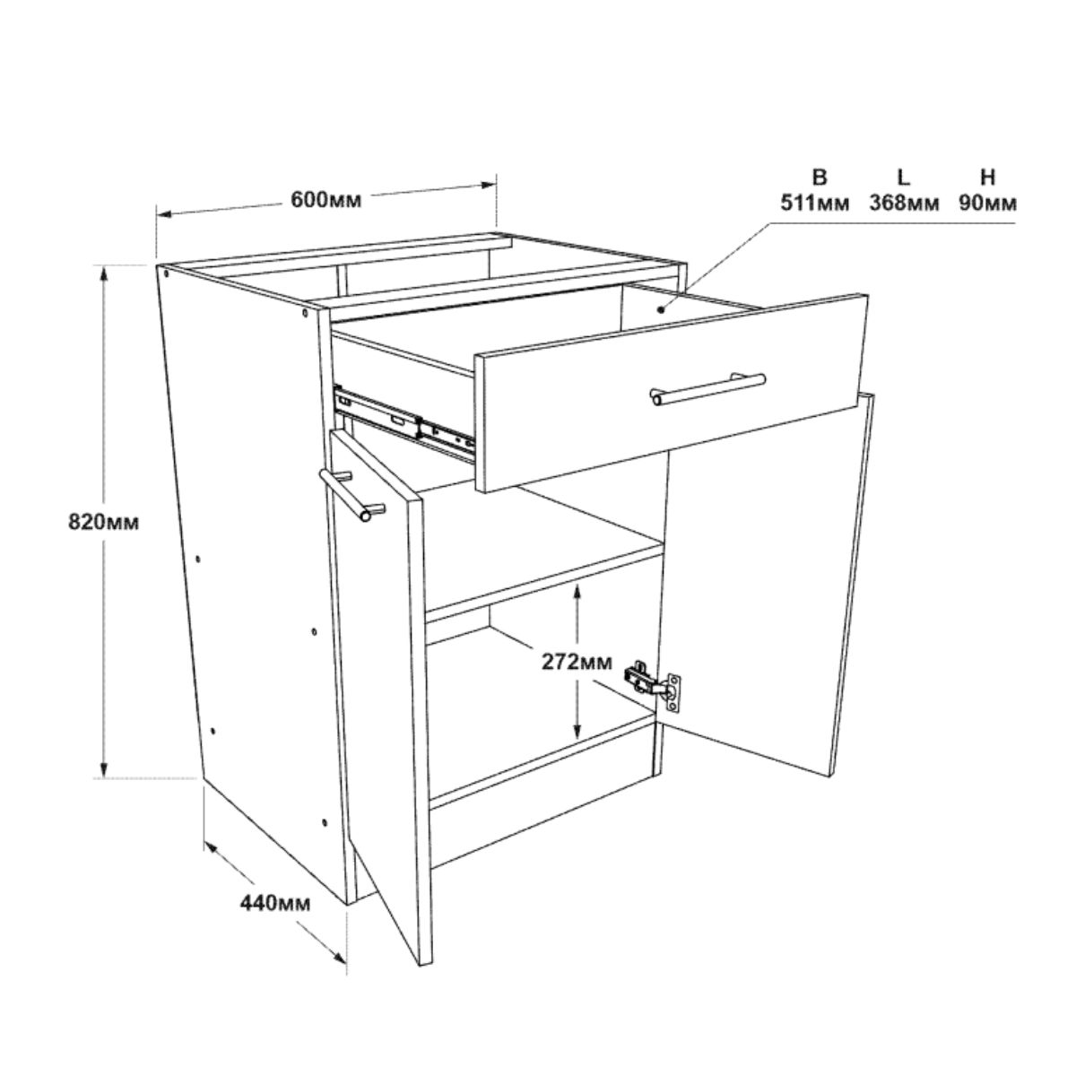 Конструкція тумби передбачає наявність висувної шухляди та внутрішнього відділення для зберігання різних кухонних предметів. Такий модуль допомагає ефективно використовувати простір кухні та забезпечує зручний доступ до вмісту.