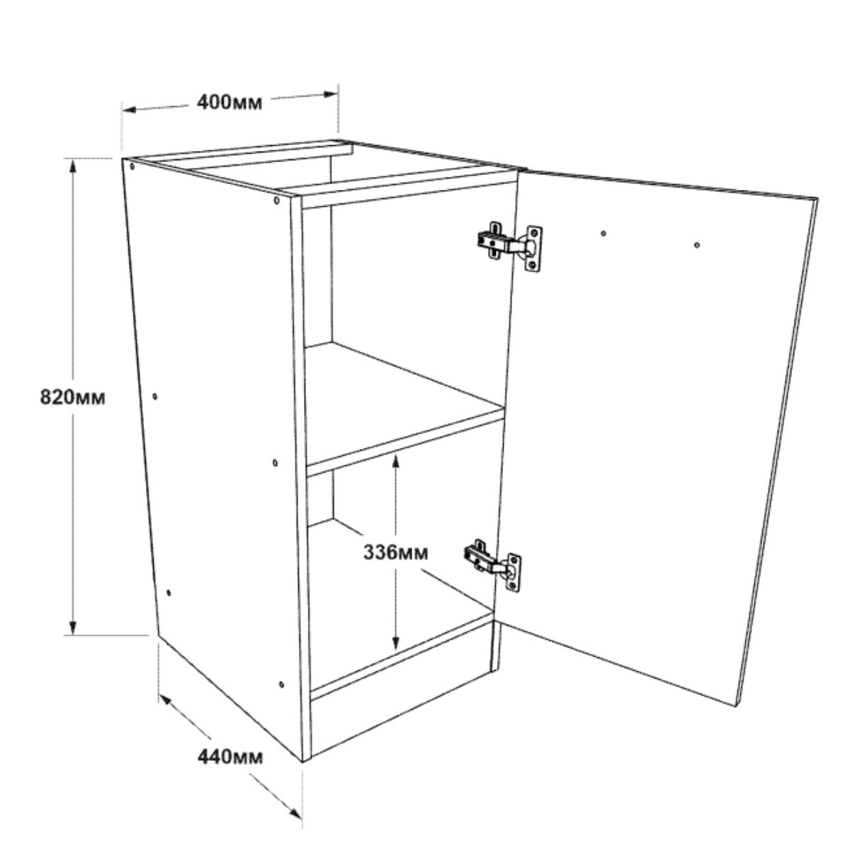 Конструкція тумби передбачає внутрішню полицю, що дозволяє зручно розміщувати кухонні предмети та ефективно використовувати простір. Такий модуль допомагає підтримувати порядок на кухні та забезпечує легкий доступ до вмісту.