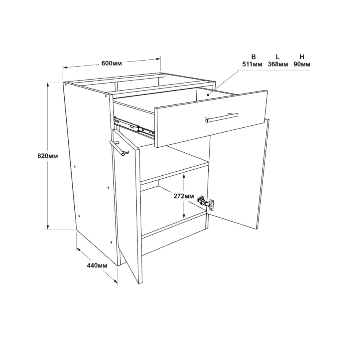 Конструкція тумби передбачає наявність висувної шухляди та внутрішнього відділення для зберігання різних кухонних предметів. Такий модуль допомагає ефективно використовувати простір кухні та забезпечує зручний доступ до вмісту.