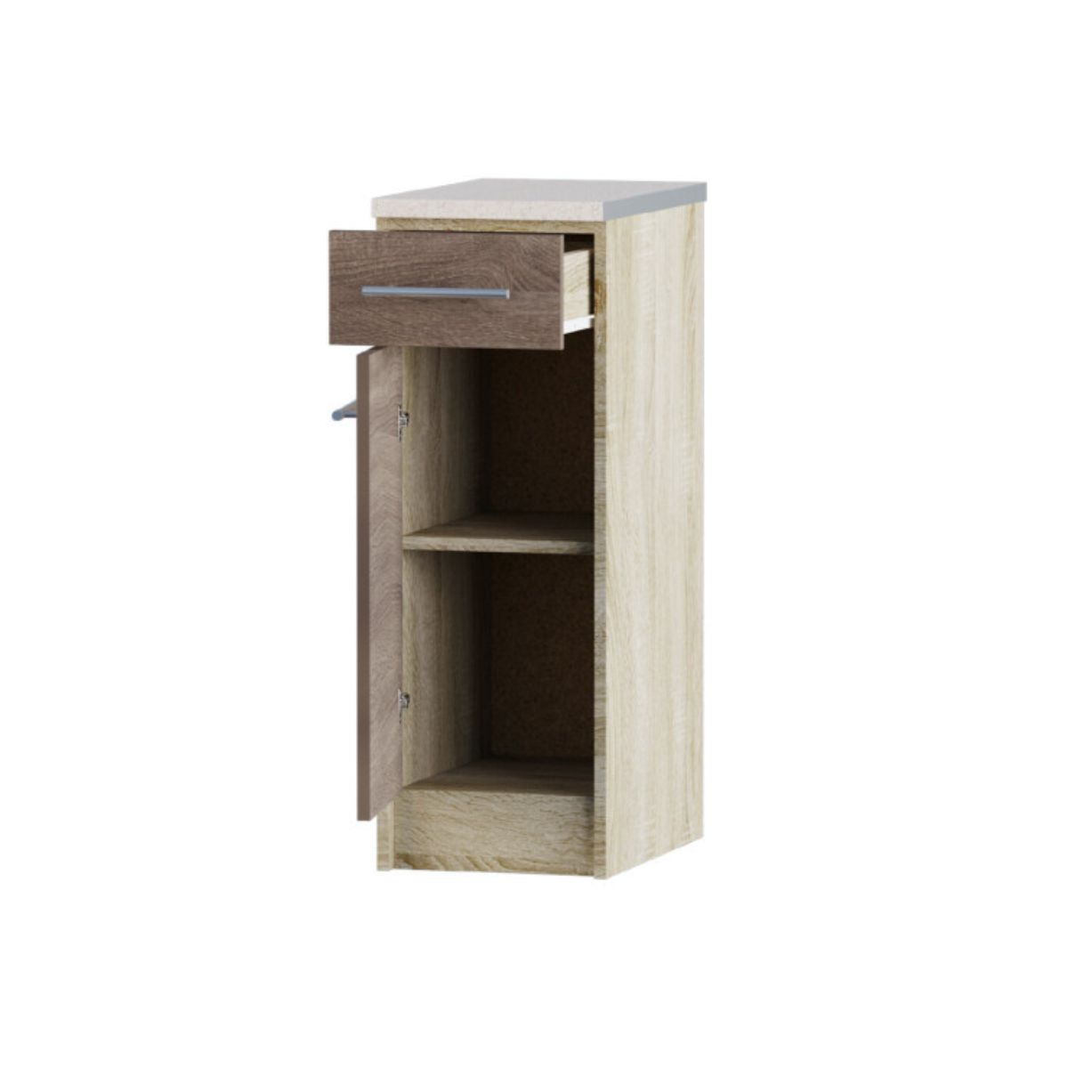 Конструкція тумби передбачає наявність висувної шухляди та внутрішнього відділення для зберігання кухонних предметів. Такий модуль допомагає ефективно використовувати простір кухні навіть у вузьких місцях та забезпечує зручний доступ до вмісту.