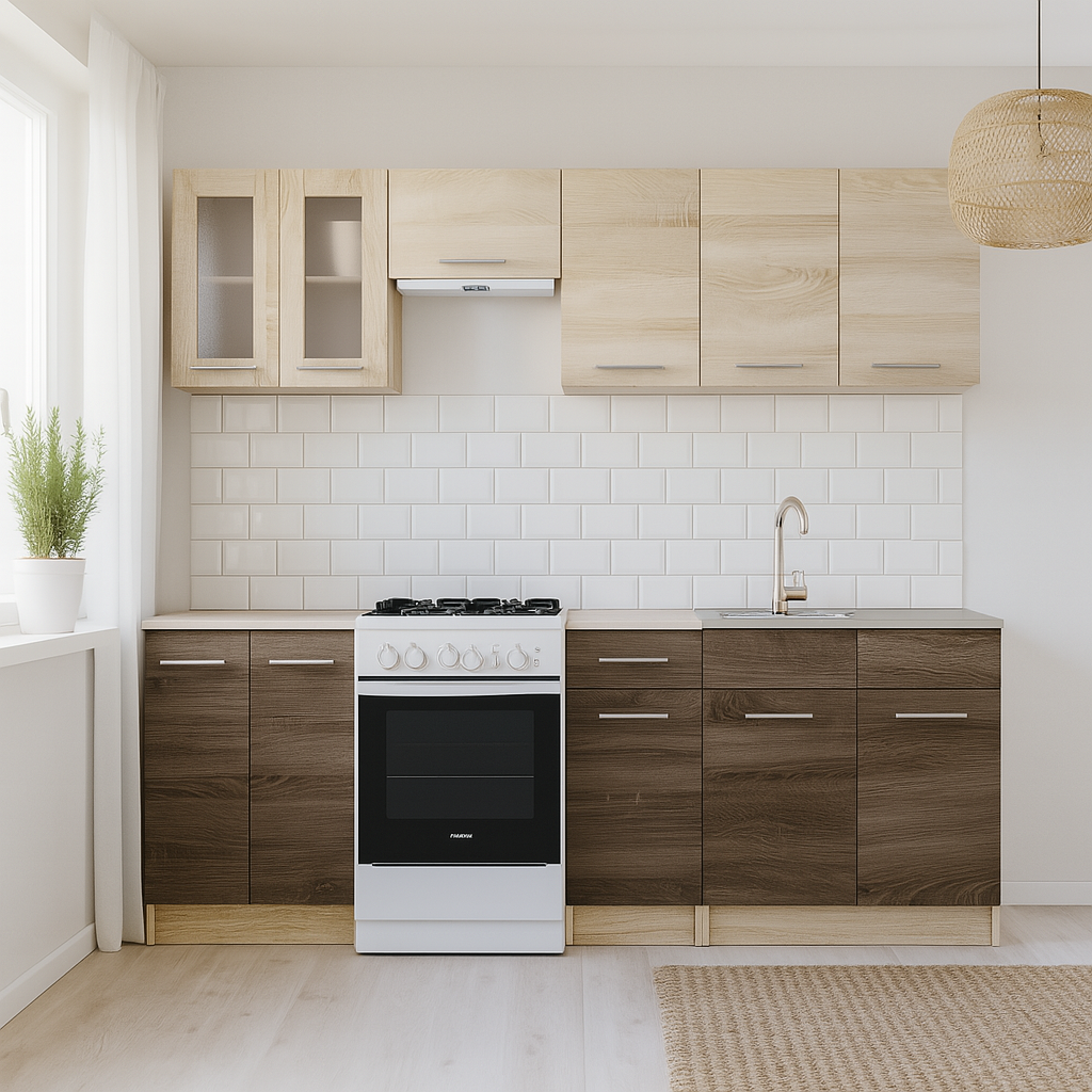 Кухонний гарнітур Серія 580 – практичний варіант для організації простору у сучасній кухні. Дизайн виконано у світлих бежевих тонах, що робить меблі візуально легкими та ідеальними навіть для невеликих кухонь.