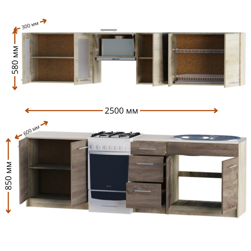Серія 580 набір 2.5 м (№1) з врізною мийкою, Дуб Сонома, Дуб Сонома Трюфель