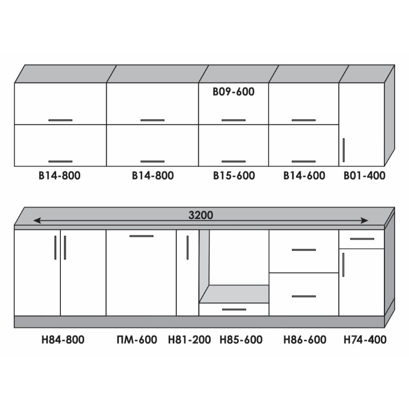 Кухонний гарнітур довжиною 3.2 м – це зручний і практичний варіант для організації простору у сучасній кухні. Простота форм у поєднанні з функціональністю конструкції роблять його ідеальним вибором для будь-якого інтер’єру.