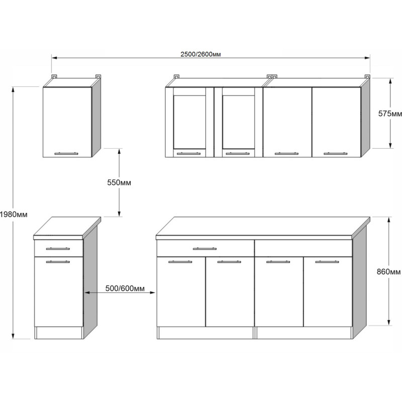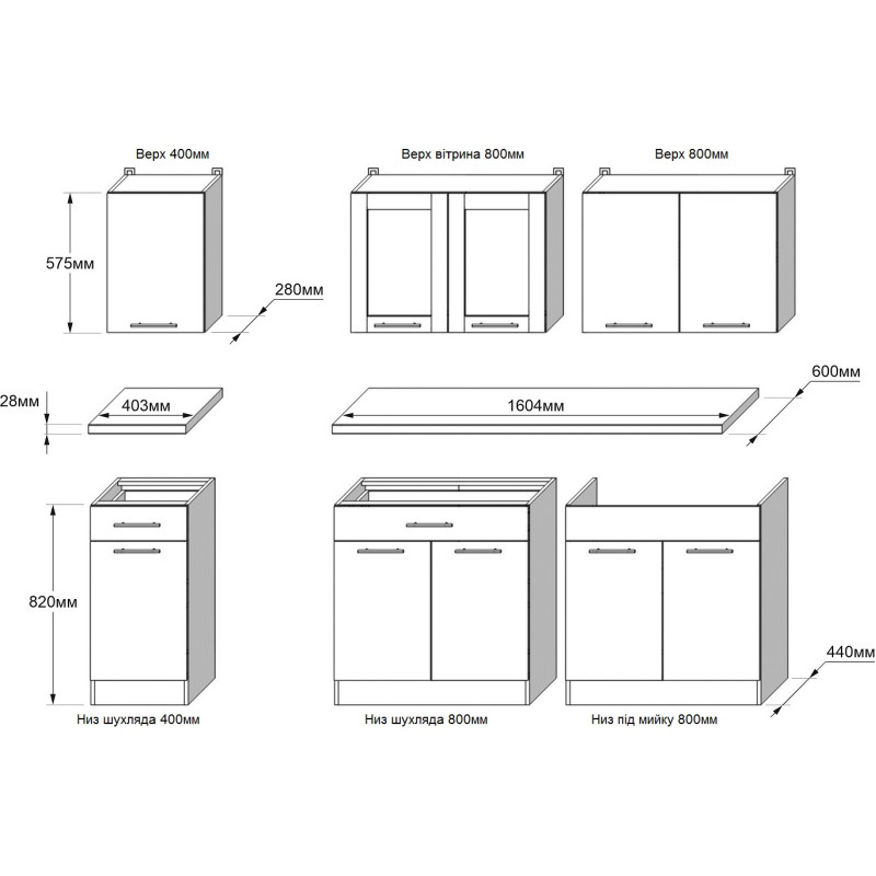 Висота нижніх шаф – 82 см (без урахування стільниці),