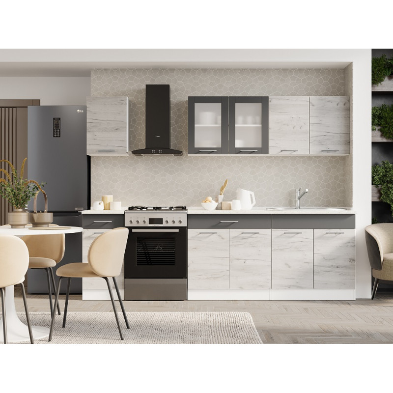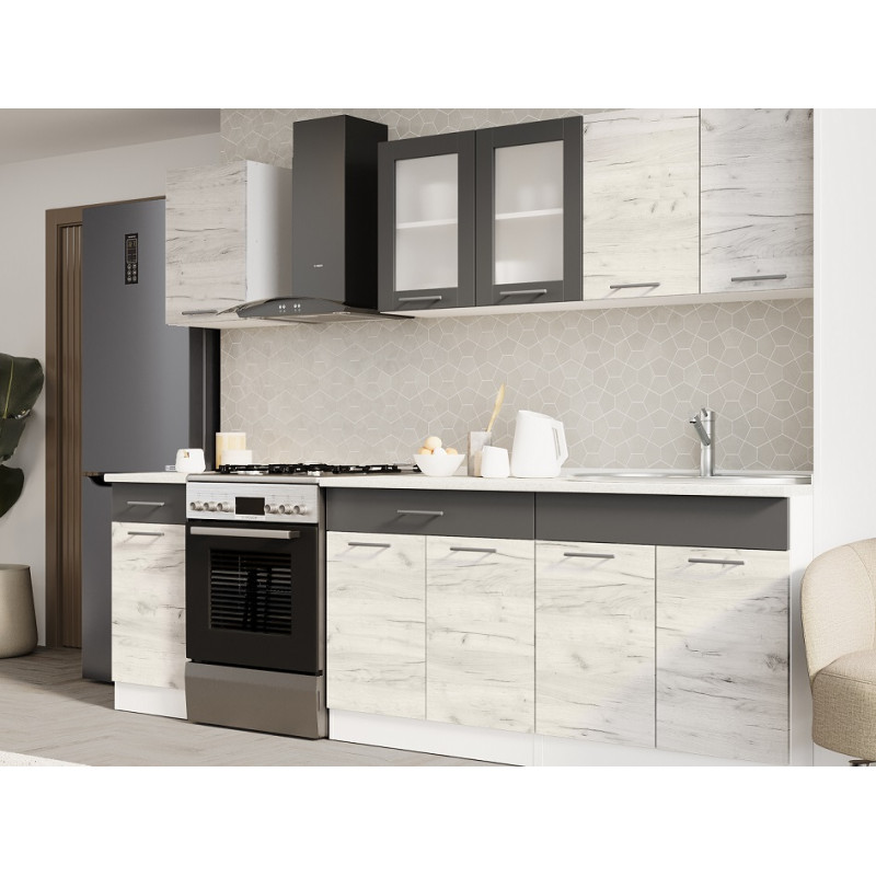 У дизайні меблевого набору переважають прості чіткі лінії і функціональні рішення: просторі робочі поверхні, тумба під мийку, вільне планування тумб і навісних шаф.