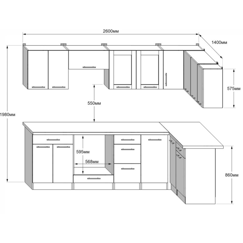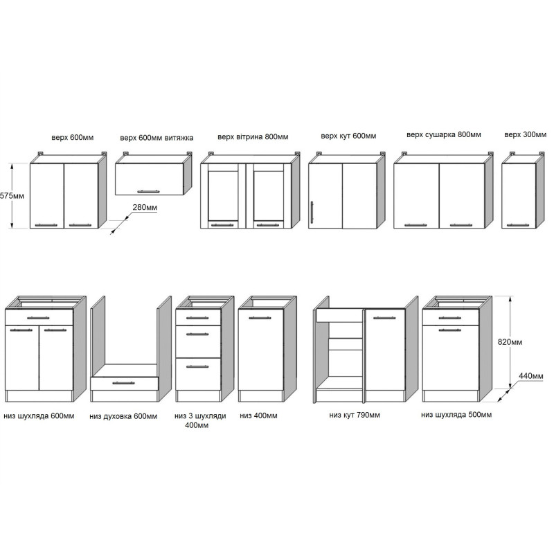 - Висота нижніх шаф – 82 см (без урахування стільниці)
