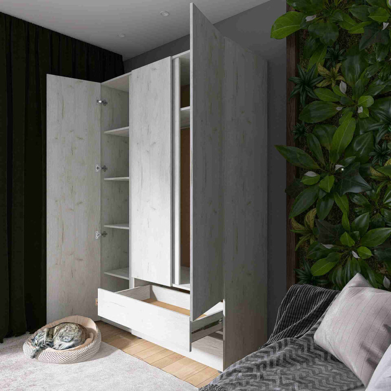Шафа тридверна Л-1370 – це елегантне та практичне рішення для вашого інтер’єру. Вона поєднує стильний дизайн, функціональність і великий внутрішній простір, дозволяючи організувати зберігання одягу, взуття, постільної білизни та інших предметів.