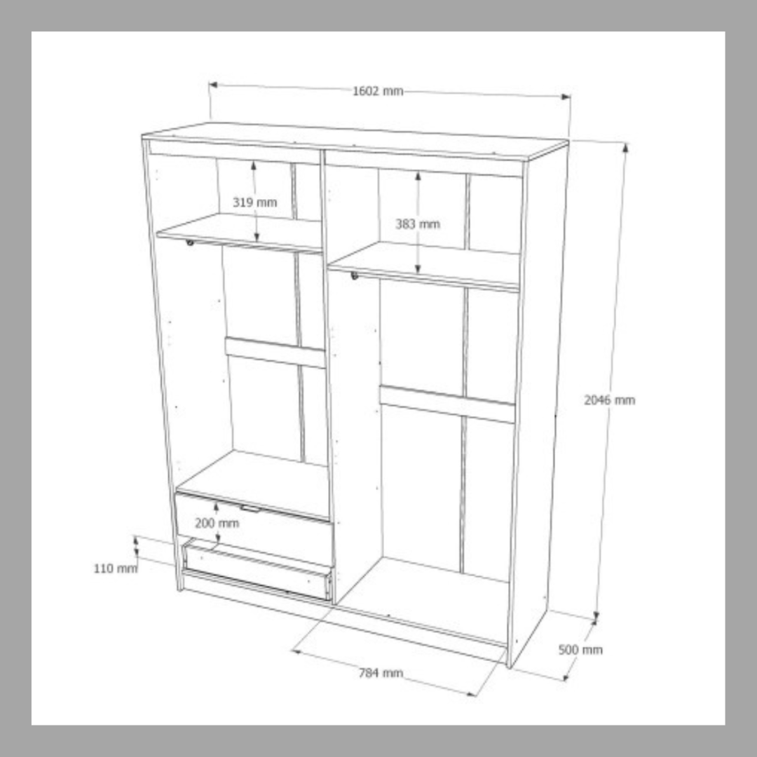 Модель виготовлена з якісного ламінованого ДСП ✅, що вирізняється стійкістю до подряпин, вологи та щоденного зносу. Поверхня приємна на дотик і легко очищується. Завдяки ширині 1600 мм, шафа вміщує велику кількість речей.
