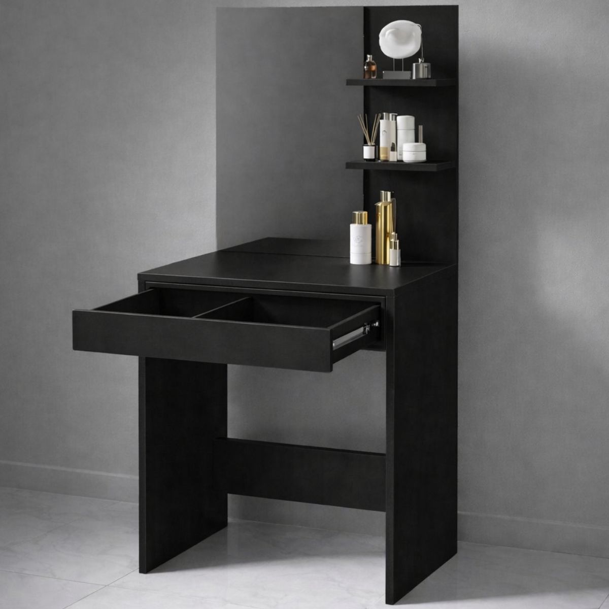 Туалетний столик з дзеркалом, полицями та шухлядою 60×40×145 см, чорний