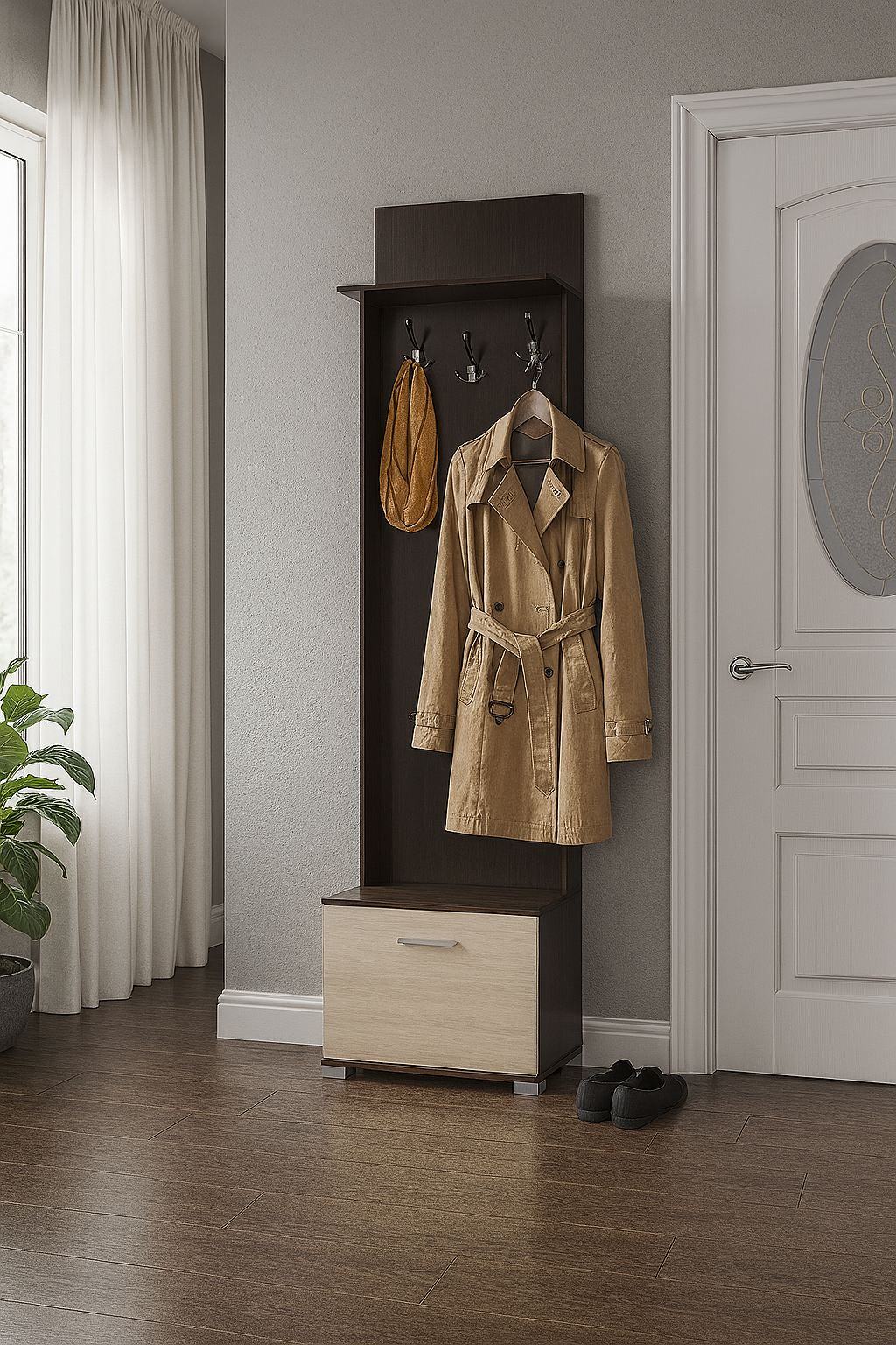 Вішалка Б-1 поєднує естетику з раціональністю: займає мінімум простору, але забезпечує максимальну зручність для зберігання верхнього одягу та взуття.